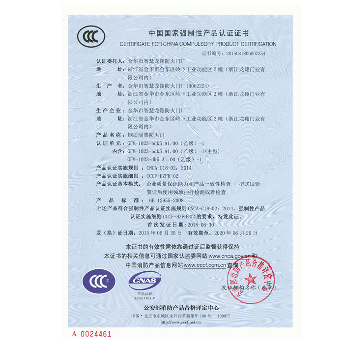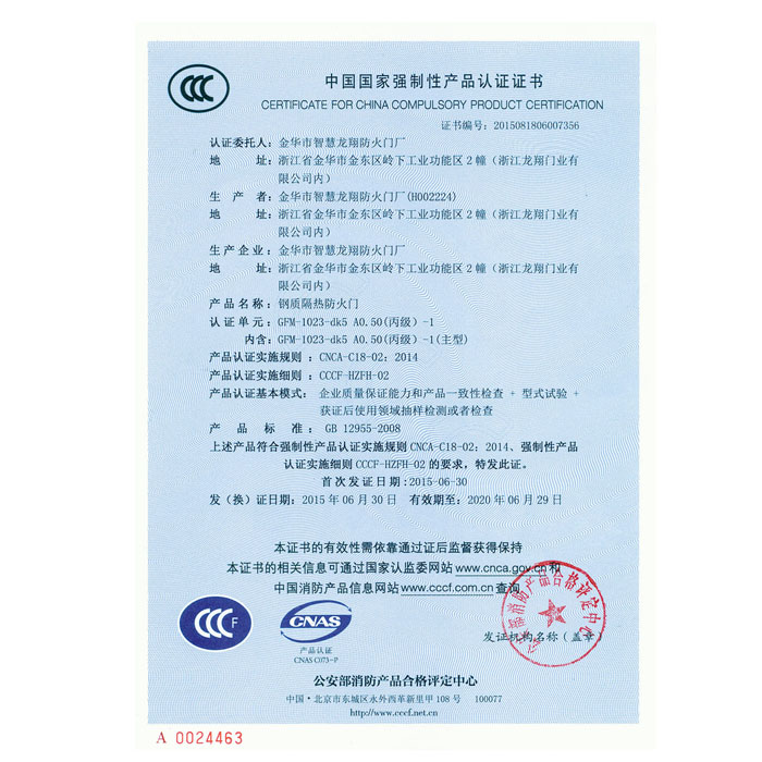 钢质隔热防火门产品认证证书